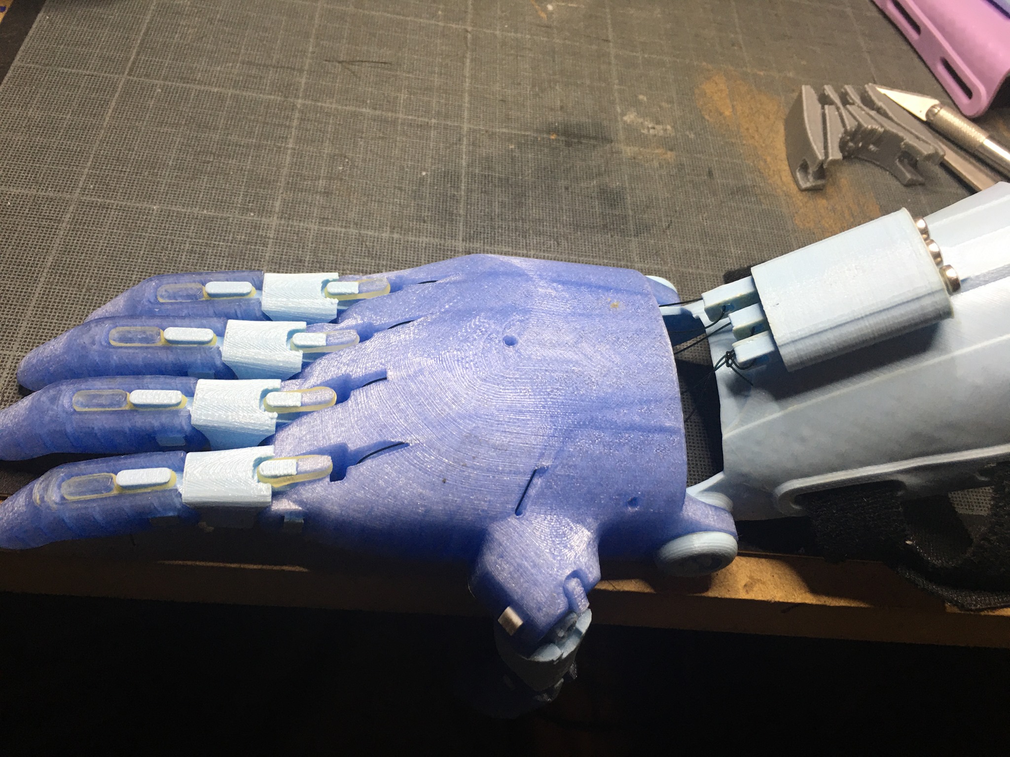 Le câblage est terminé, en actionnant l’appareil (en appuyant sur le gantelet tout en maintenant la paume en position) les doigts doivent se fermer.