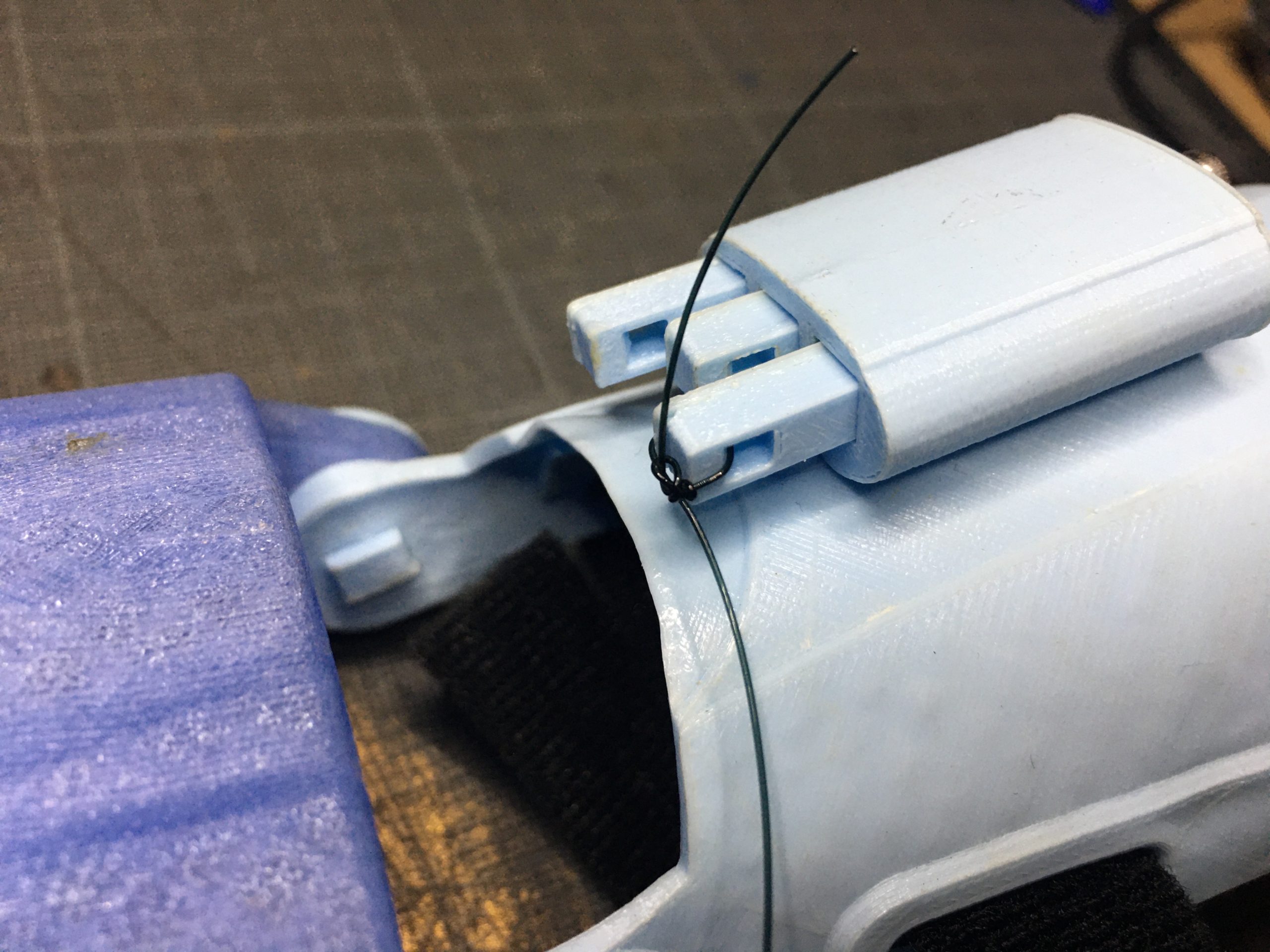 Le bloqueur de poignet sert, comme son nom l’indique, à immobiliser paume et gantelet avec le bon angle de 30° le temps de faire le câblage en toute sérénité.